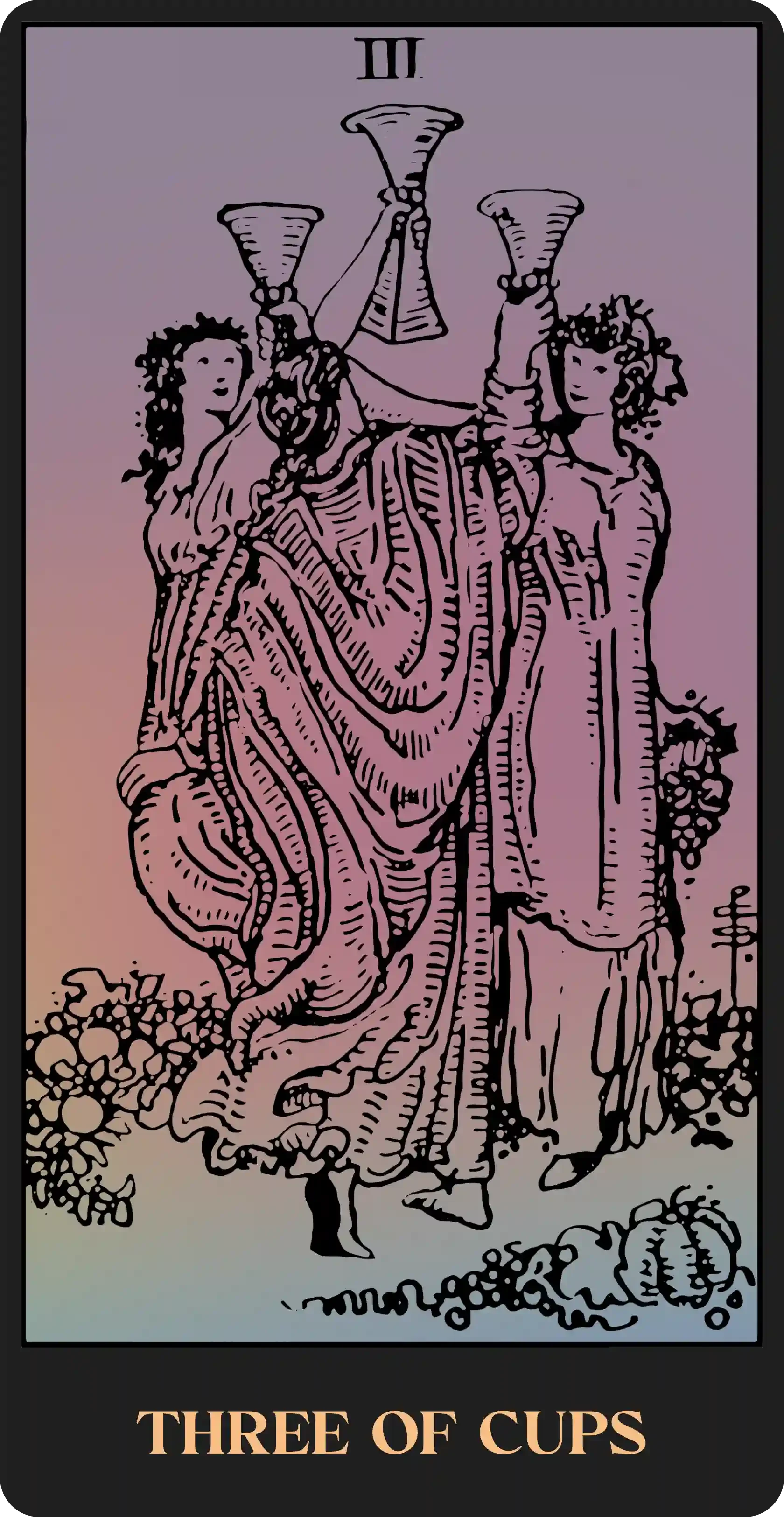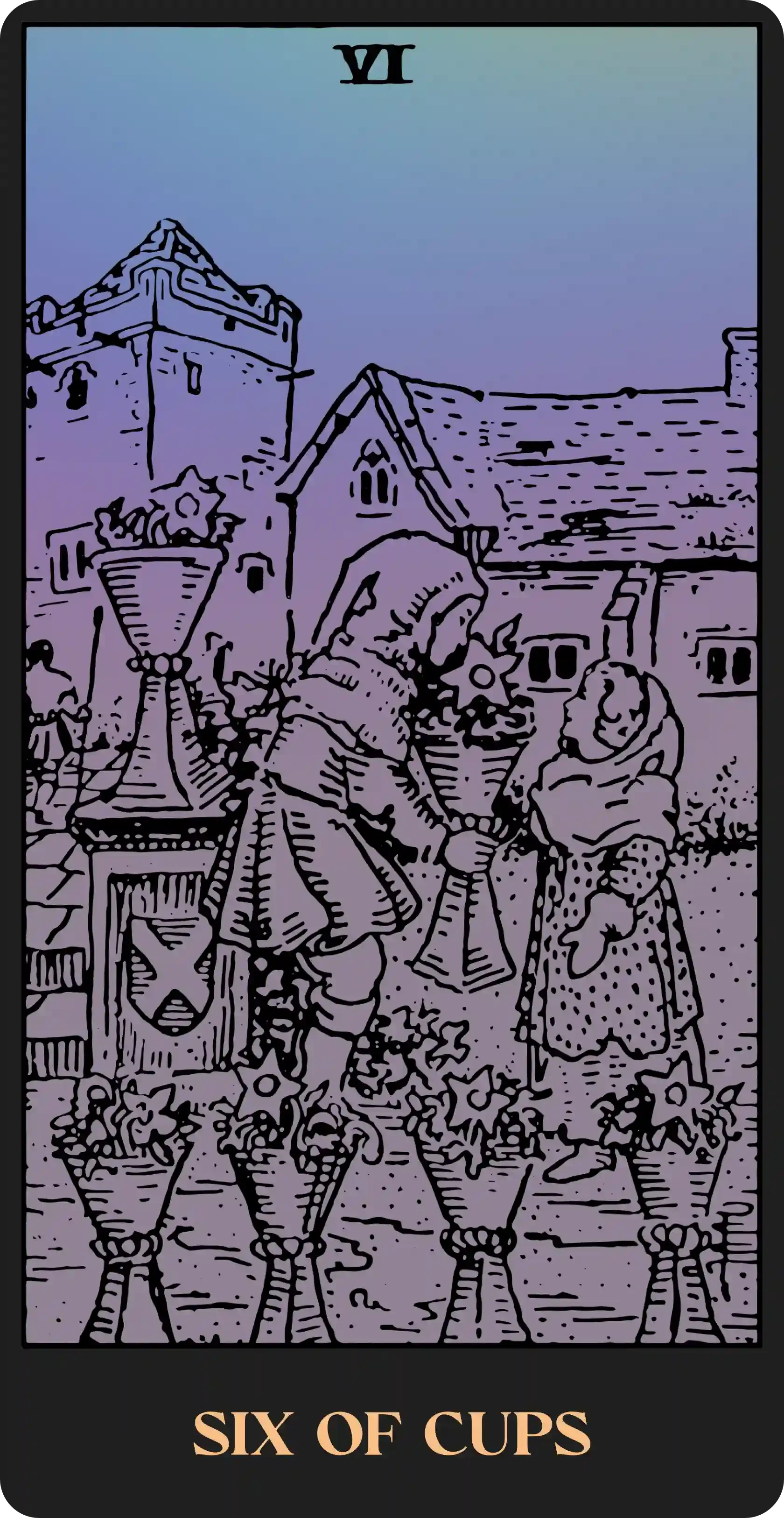 If our cup runs dry, we may feel empty and depressed (Five of Cups), unable to exert ourselves or even see the goals we once strived to reach. If we bottle up, the pressure may build and explode without warning, or the water inside may stagnate and become unhealthy, manifesting as cynicism and apathy (Four of Cups). Still, at other times, we may need to protect the water in our cups from those who would take advantage. The key is to balance our flow, pouring equally into others as they pour into us (Two of Cups, Three of Cups, Six of Cups). The cups of the Minor Arcana can hint at ways to move toward this inner and outer equilibrium.