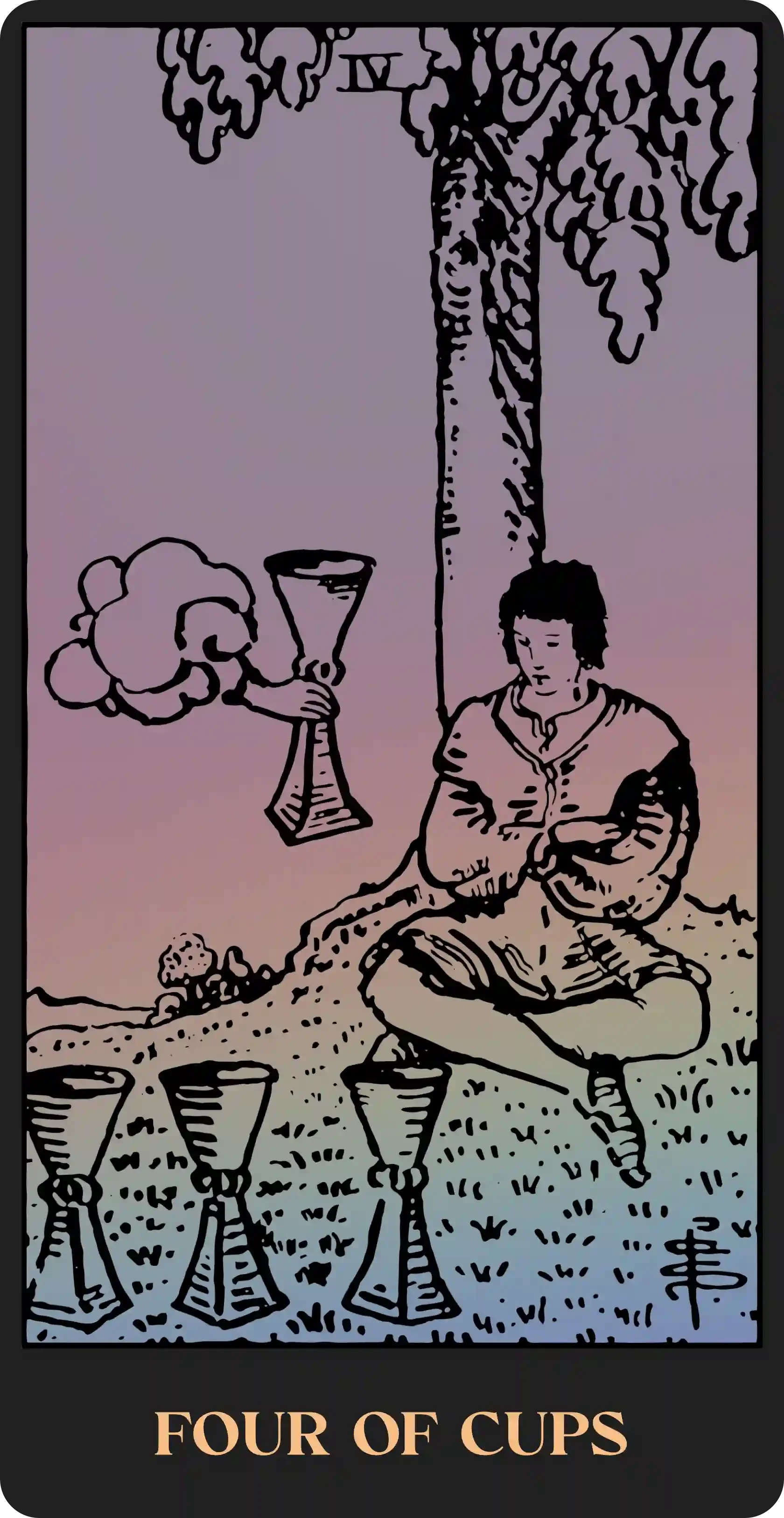 The heart is also the center of intuitive feeling; thus, the Suit of Cups tells us that we must draw inward and tune in to our intuition before making a decision (Four of Cups). Cups can also warn us that we are ignoring logic and leaning too heavily, perhaps dramatically, into an emotionally driven state of instability (Knight of Cups, reversed). All is a reminder that the wisdom of our emotions can only shine through if we remain grounded, open, and balanced (Queen and King of Cups).