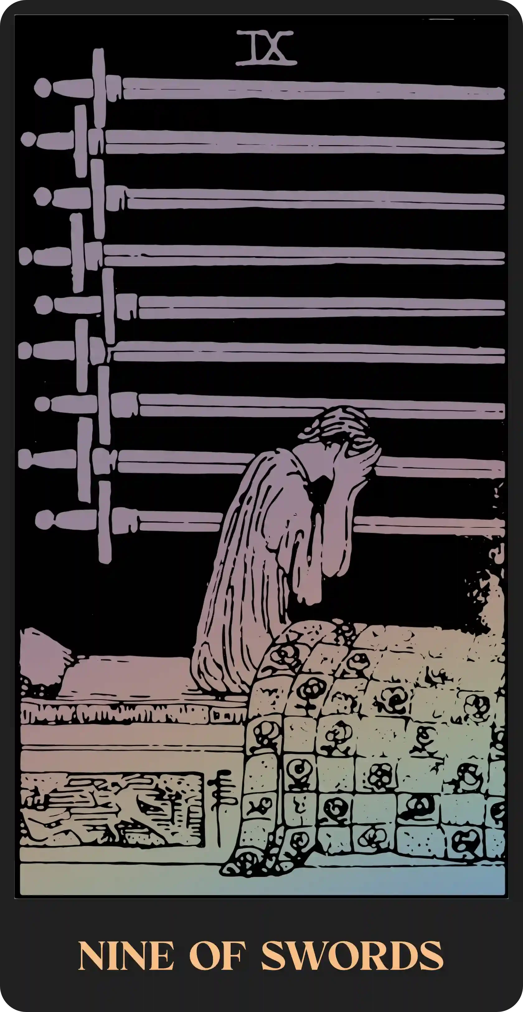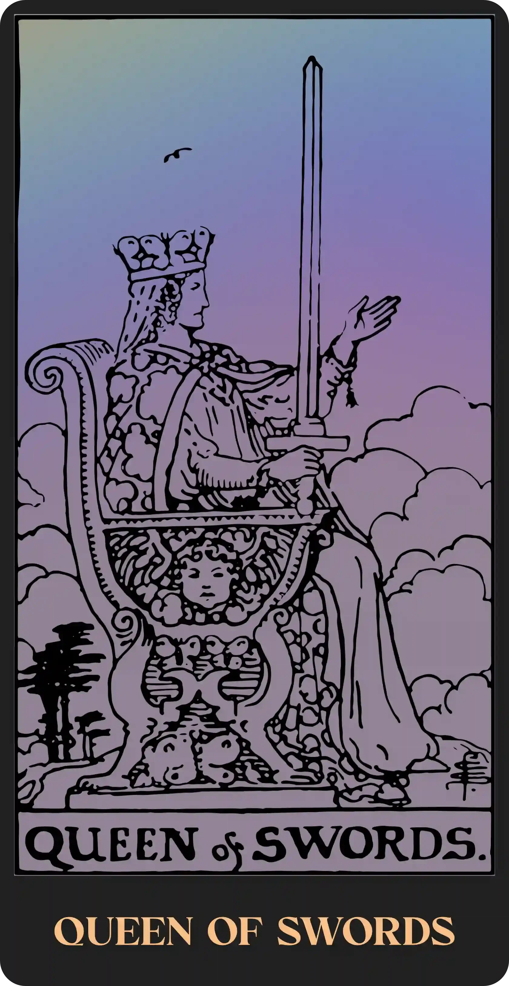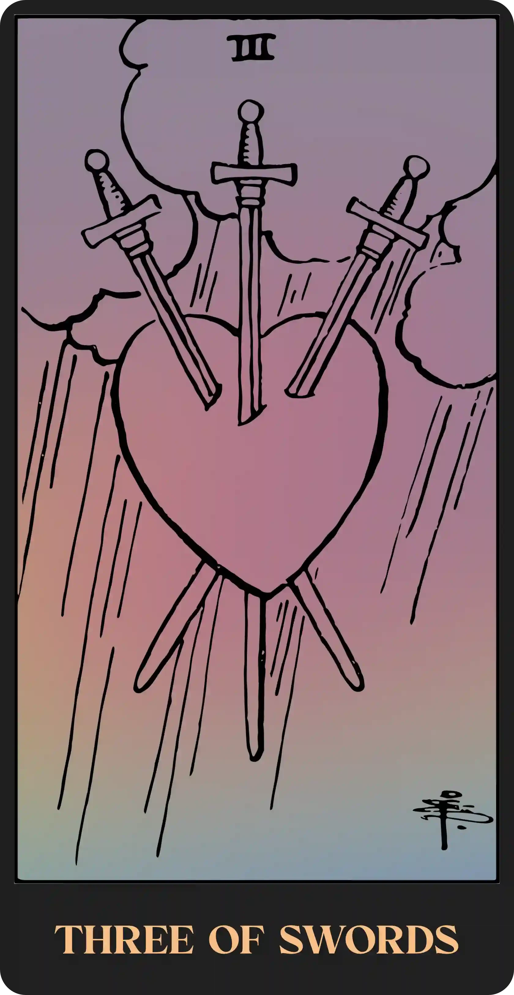 Although forged by scalding temperatures, steel becomes cool to the touch. This coldness reflects the mind that leans too far into logic, appearing harsh, ruthless, and distant. This behavior cuts us off from our hearts and others. You will consistently find this theme of solitary pain throughout the Suit of Swords, most acutely rendered in the Three of Swords, which shows a thrice-stabbed heart underneath a stormy sky. Many characters within the Suit of Swords are also blinded, trapped, and tortured by their minds (Two, Eight, and Nine of Swords). They overthink and spin helplessly in their thoughts like a swirling wind, unable to see past the storms of confusion and make a decision (Two of Swords).