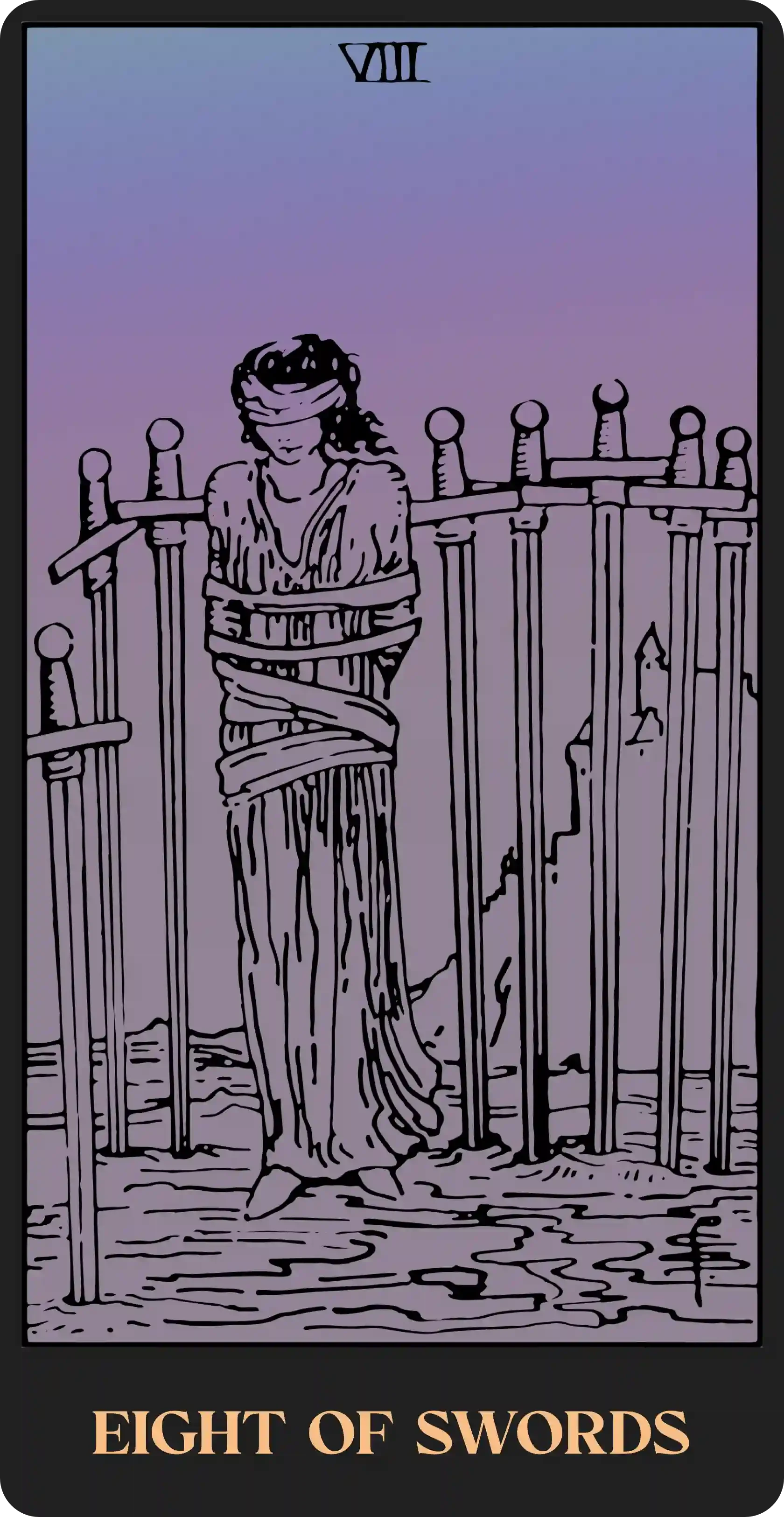 Like the figure in the Eight of Swords, surrounded by sharp edges that could cut them loose, we must realize our ability to slash through these mental binds. Sometimes, this means leaving rough waters for a calmer shore (Six of Swords); at other times, it means allowing ourselves to rest our weary minds (Four of Swords). We all must inevitably face the winds of change, and we will not always make the best decisions. With time, we must learn from our mistakes, face the truths we would rather avoid, and remember that one step forward is better than staying in the same place.